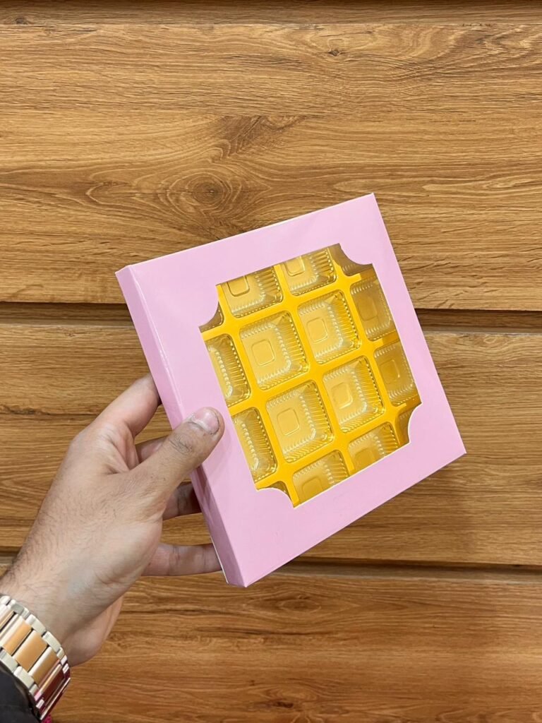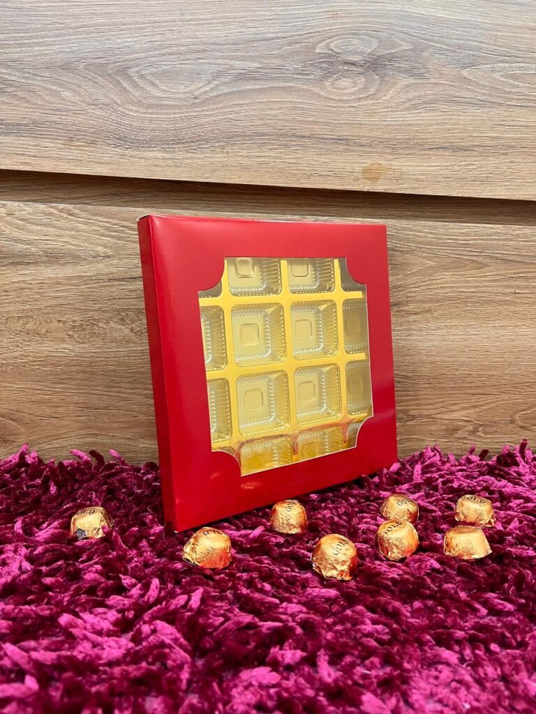 Premium 16-cavity chocolate packaging box made with high-quality 300 GSM SBS card. Strong, elegant, and cavity-free design for a flawless chocolate presentation.